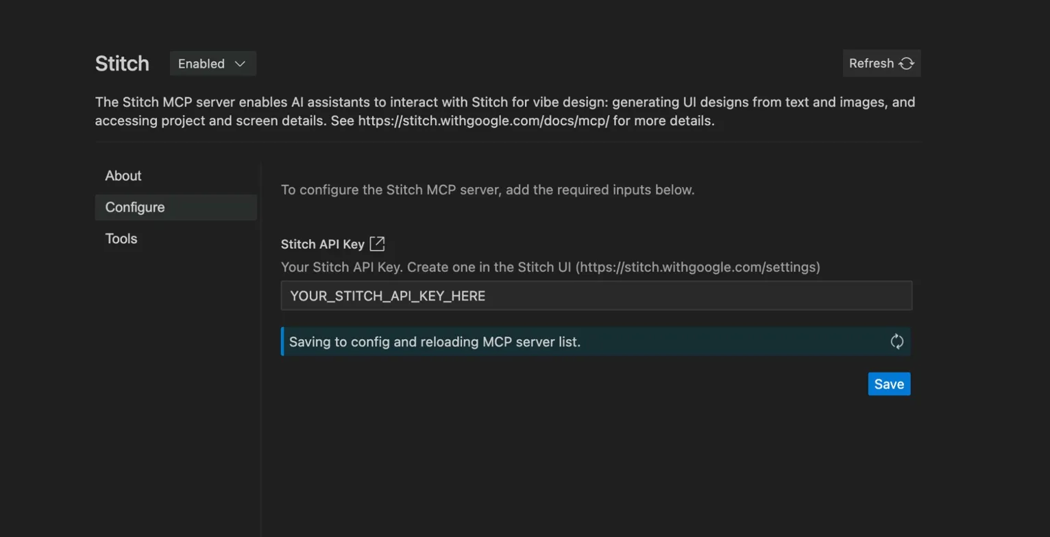 Installing the Stitch MCP server inside Google Antigravity