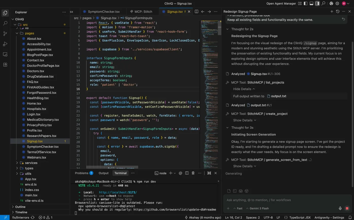 Antigravity automatically reads your existing code, passes the full context to Stitch, and starts generating. You can watch the entire process in real time on the right panel — every MCP tool call, every decision, completely transparent.