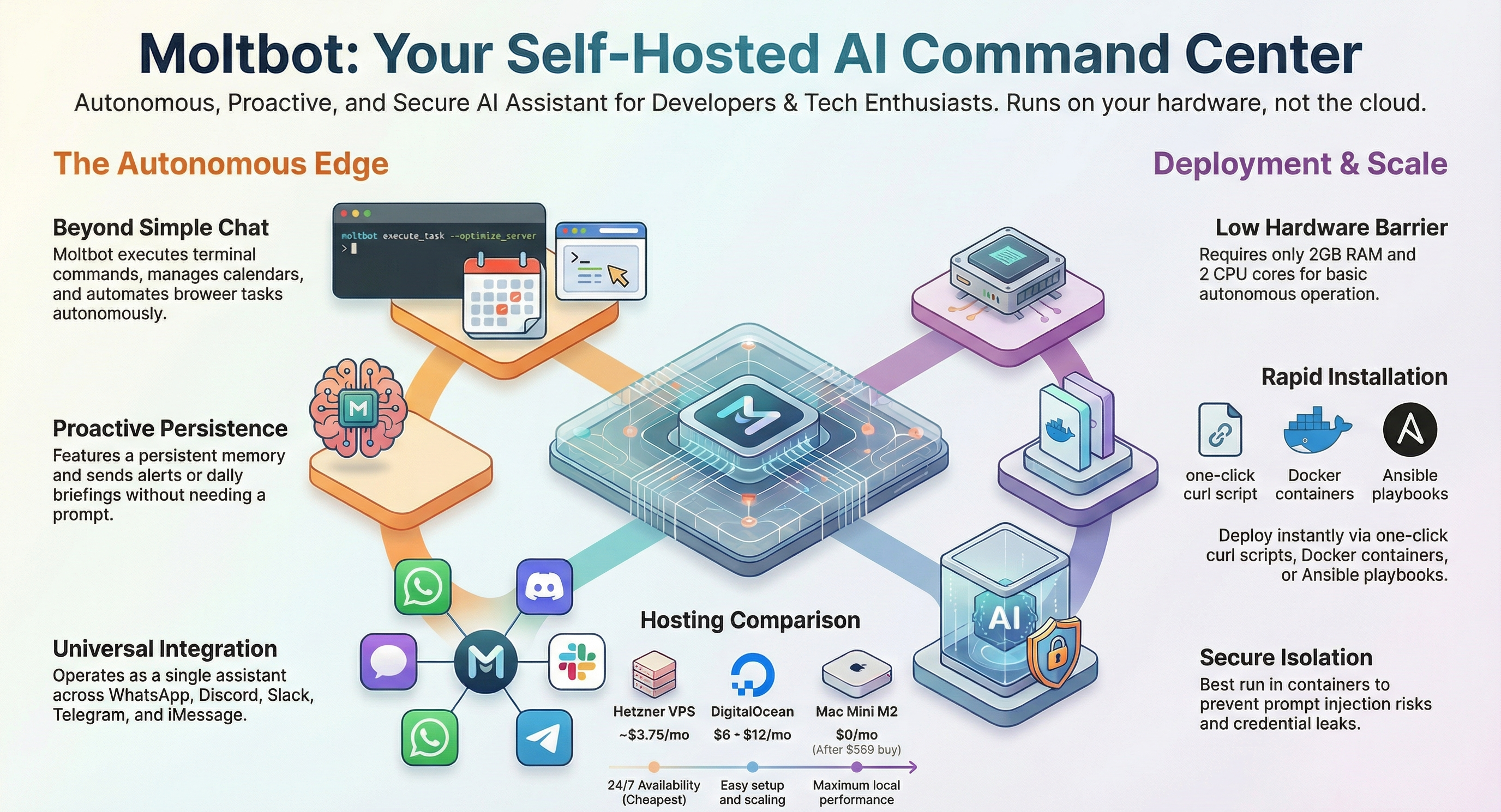 Figure: Moltbot's autonomous features, deployment options, and hosting comparison at a glance