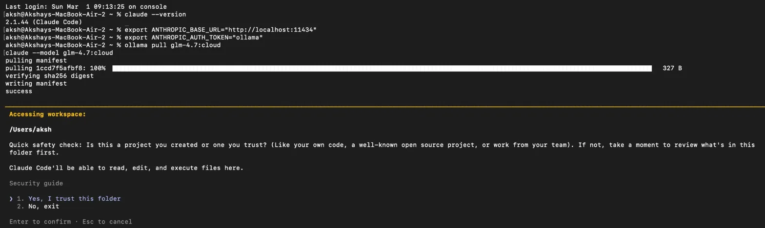 Claude Code v2.1.44 running successfully via glm-4.7:cloud on a MacBook Air — no local GPU needed